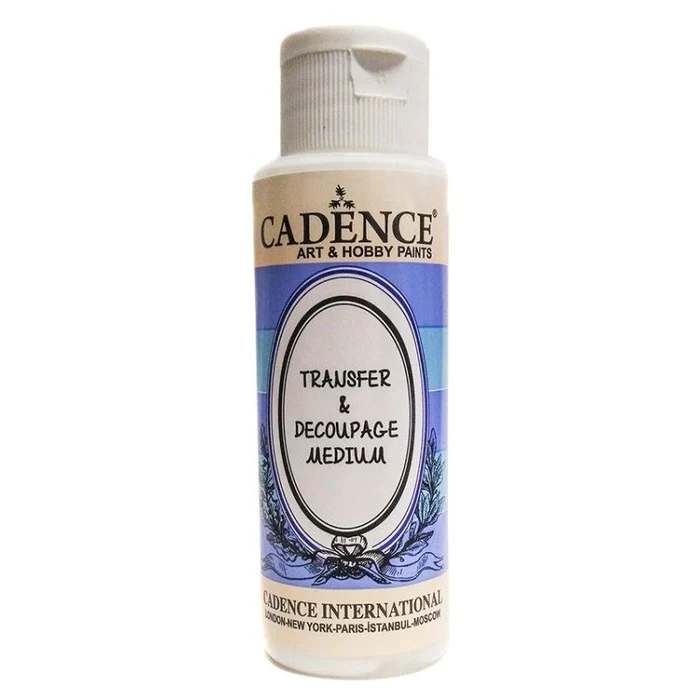 Descripción Transfer medium Cadence para decoupage con base de agua para transferir imágenes decorativas sobre otras superficie lisa como bandejas, se recomienda que la base sea clara. Se limpia fácilmente con agua y jabón, No es tóxico. Dispone de certificación europea CE y EN71. Envase de 70 ml.